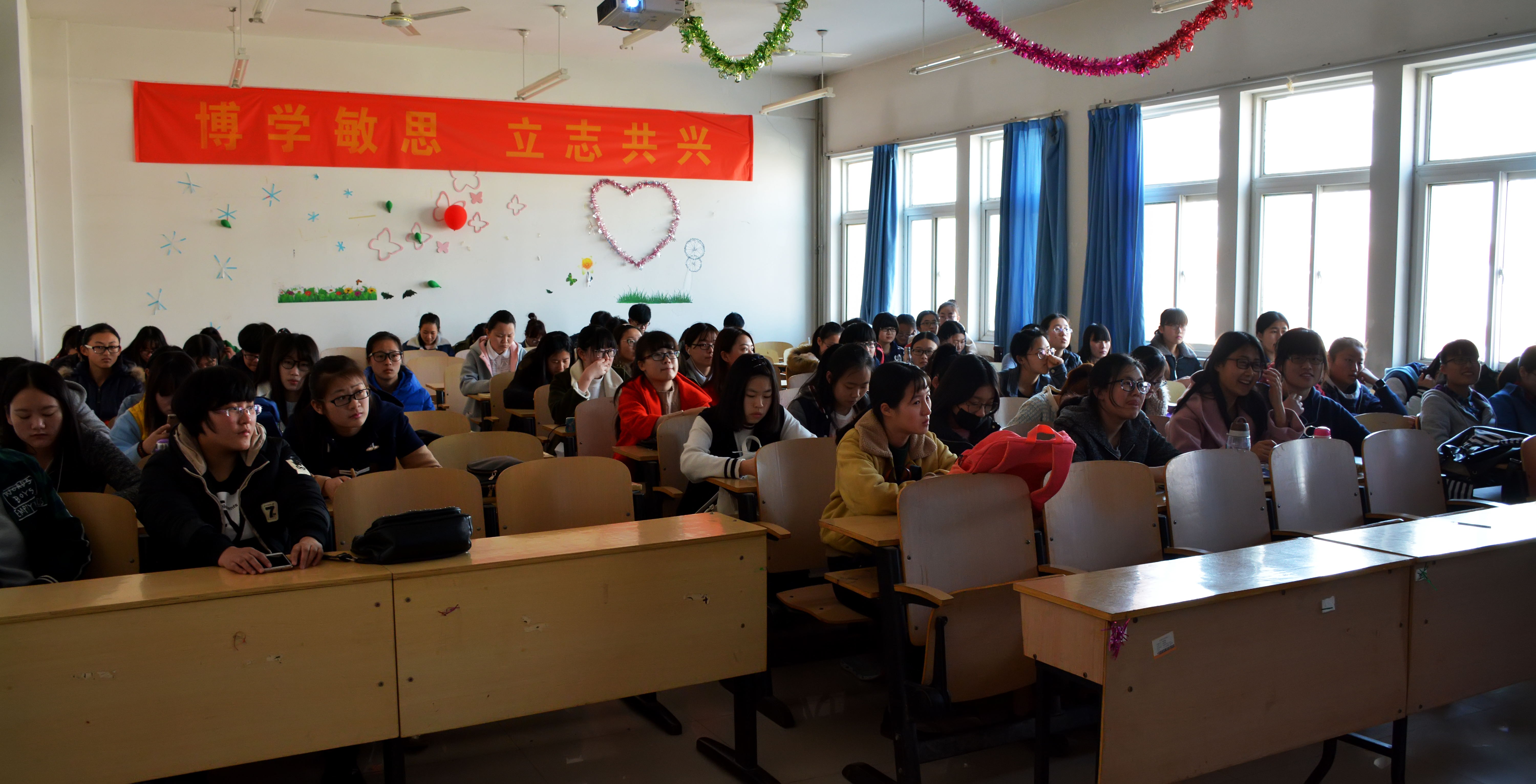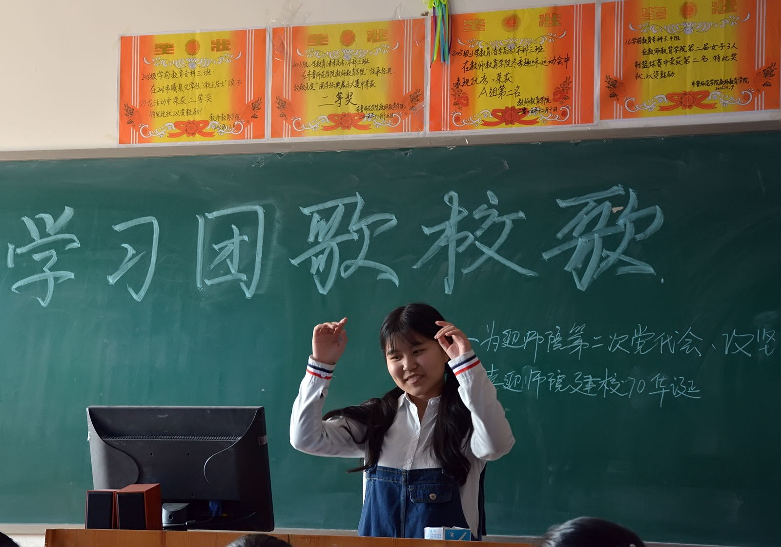 学唱团歌校歌既可以激励自己又可以振奋他人,在师院70华诞来临之际,我院同学积极展开相应活动,大声歌唱。有的班级开展户外校歌演唱,校歌的余音,绕着学院的文化长廊,激励着师院每一位求知者。各班文艺委员和其他班委协同合作,带动着同学们,大荧幕上歌词闪烁,他们声音嘹亮,走廊任何一个角落都能听到他们的歌声回响。