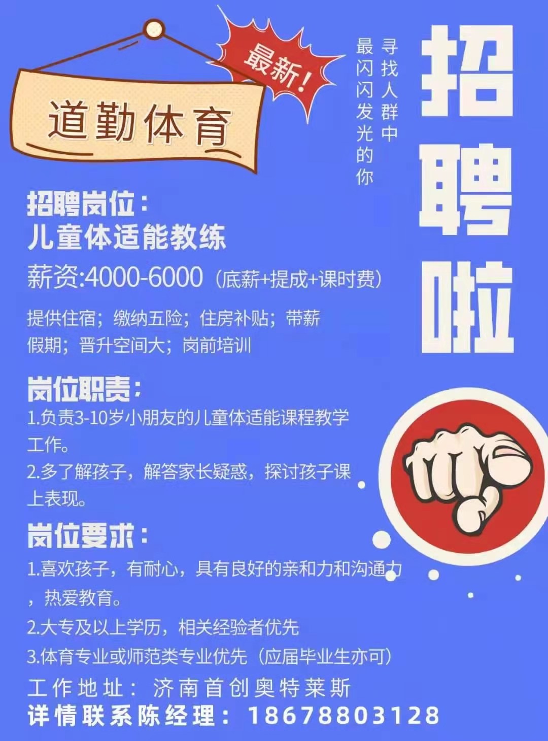 道勤体育教育面向的3-10岁的孩子,该单位有意招聘学前教育、小学教育的同学,发给同学们,有意向的同学可以联系看看,待遇还不错。