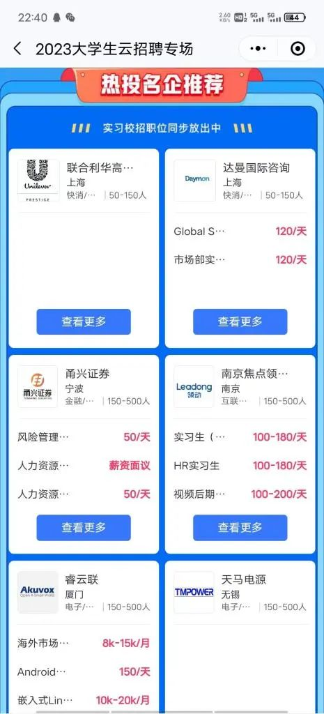 进入小程序首页后,选择【招聘专场】,即可进入本次招聘活动专场页面,获取招聘企业信息,选择和投递职位。