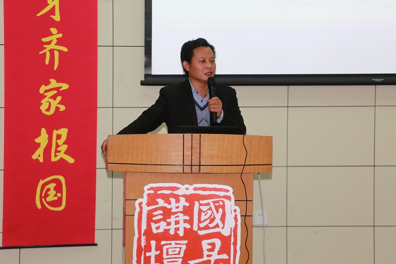 在《长征组歌》慷慨激昂的旋律中,讲座的帷幕拉开。孙建凯书记首先阐述了红军长征胜利纪念日的由来,以及甘肃会宁和宁夏将台堡成为长征会师地的原因。随后,他结合自己对习近平总书记在纪念中国工农红军长征胜利80周年纪念大会上的讲话精神的理解,以及自己带领学生“重走长征路”的感悟,对“长征是什么”、“为什么说长征是伟大的”以及“怎样继承和弘扬长征精神”三个问题予以论述。同时,讲述了红军将领贺炳炎在战斗中右臂中弹骨碎揉烂、在缺少麻醉药的情况下用木锯断臂的英勇事迹。接着,伴随时而壮怀激烈、时而婉转悲凉的背景音乐,两学生通过图片展示,满怀敬仰之情地讲述了在长征中最惨烈的湘江战役中,红34师师长陈树湘战斗失败被捕后“断肠名志”、“为苏维埃流尽最后一滴血”的感人故事,讲述了瑞金年轻村妇、“共和国第一军嫂”陈发姑“毅然支持丈夫参加红军”、“深夜泪别丈夫相约重逢”、“七十五年痴心不改望夫归、每年为夫编一双草鞋缝一双布鞋”最悲壮的红色爱情经典。最后,在根据陈发姑的故事改编的电影《发姑》的主题曲《一生守望》的沁人心脾的吟唱中,“国是讲坛”第六讲落下了帷幕。“¼¼想他梦他思念他夜夜望月牙,他信革命我信他,心儿随他走天涯¼¼。”这一沁人心脾的歌与曲则在大家的脑海中久久回荡。
