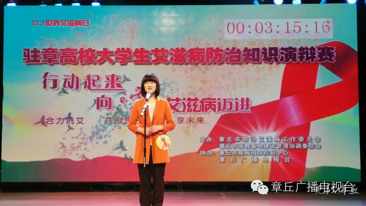 为深入开展艾滋病防治工作,进一步宣传普及防治知识,营造健康良好的社会氛围。 2015年12月1日由章丘市防治艾滋病工作委员会、章丘市高等职业教育基地建设管理协调委员会主办的驻章高校大学生艾滋病防治知识演辩赛,在章丘广播电视台举行,我院学生隋姣姣同学通过稳定的发挥最终获得本次演辩大赛三等奖。