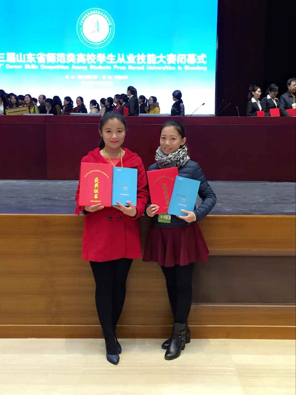 11月20日至22日,第三届全省师范类高校学生从业技能大赛决赛在鲁东大学举办。本届大赛中,我校共有19名选手参加,经过两天的激烈角逐,共有三名同学荣获一等奖。其中,我院胡宁同学和孟祥婷同学分别荣获学前组一等奖第四名和小学语文组一等奖第一名的好成绩,同时,王玉华老师和滕秀芹老师荣获优秀指导教师奖。