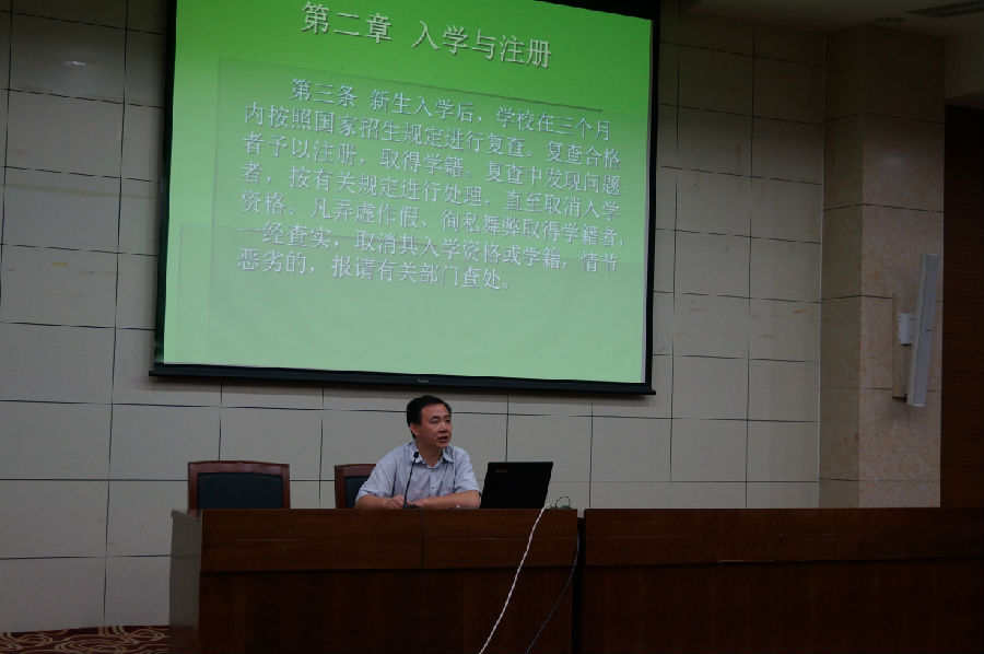 为帮助YL23455永利集团新生尽快融入师院这个大家庭,9月23日晚,YL23455永利集团组织举办2015级新生入学教育之学生学籍管理规定解读报告会。报告会邀请学校教务处学籍管理科邵恒科长作报告,学院团总支书记孙建凯主持,部分辅导员和2015级全体新生参加并聆听了报告。
