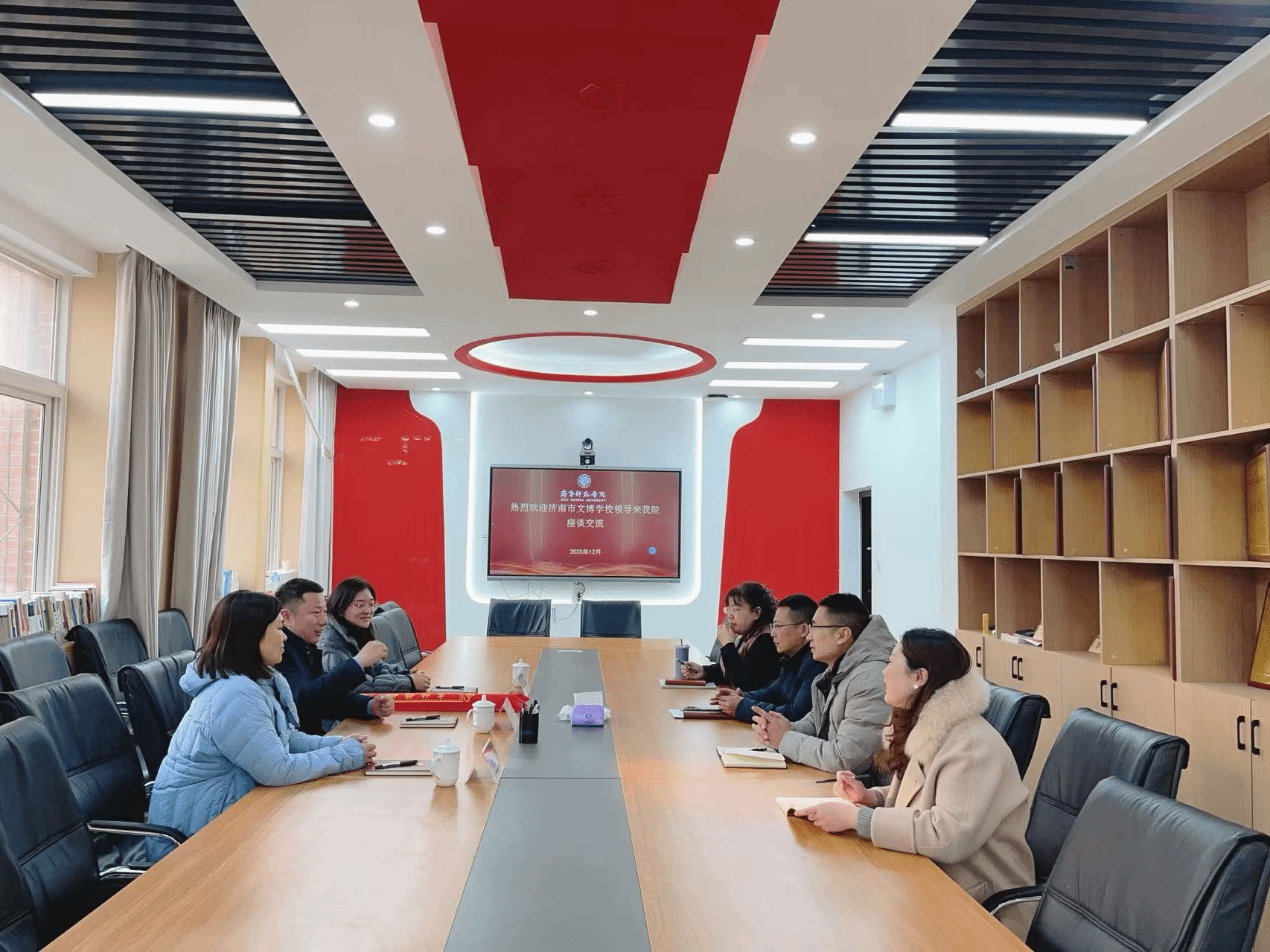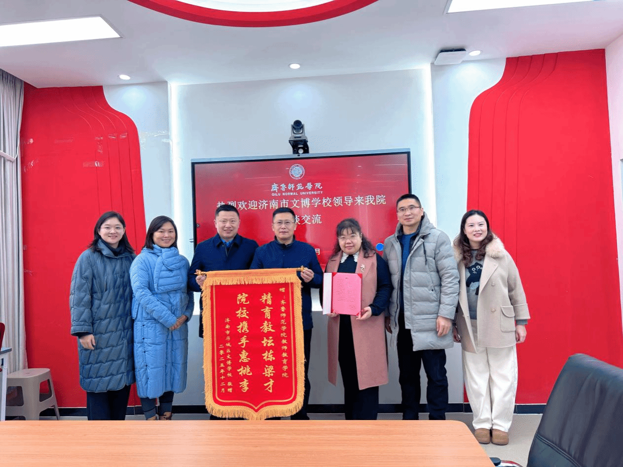 12月20日,济南市历城区文博学校崔京琦校长、朱妍校长与张旭主任一行专程赴我院开展校际交流活动,并向我院赠送锦旗,对我院实习学生在教育教学实践中的突出表现给予高度评价。