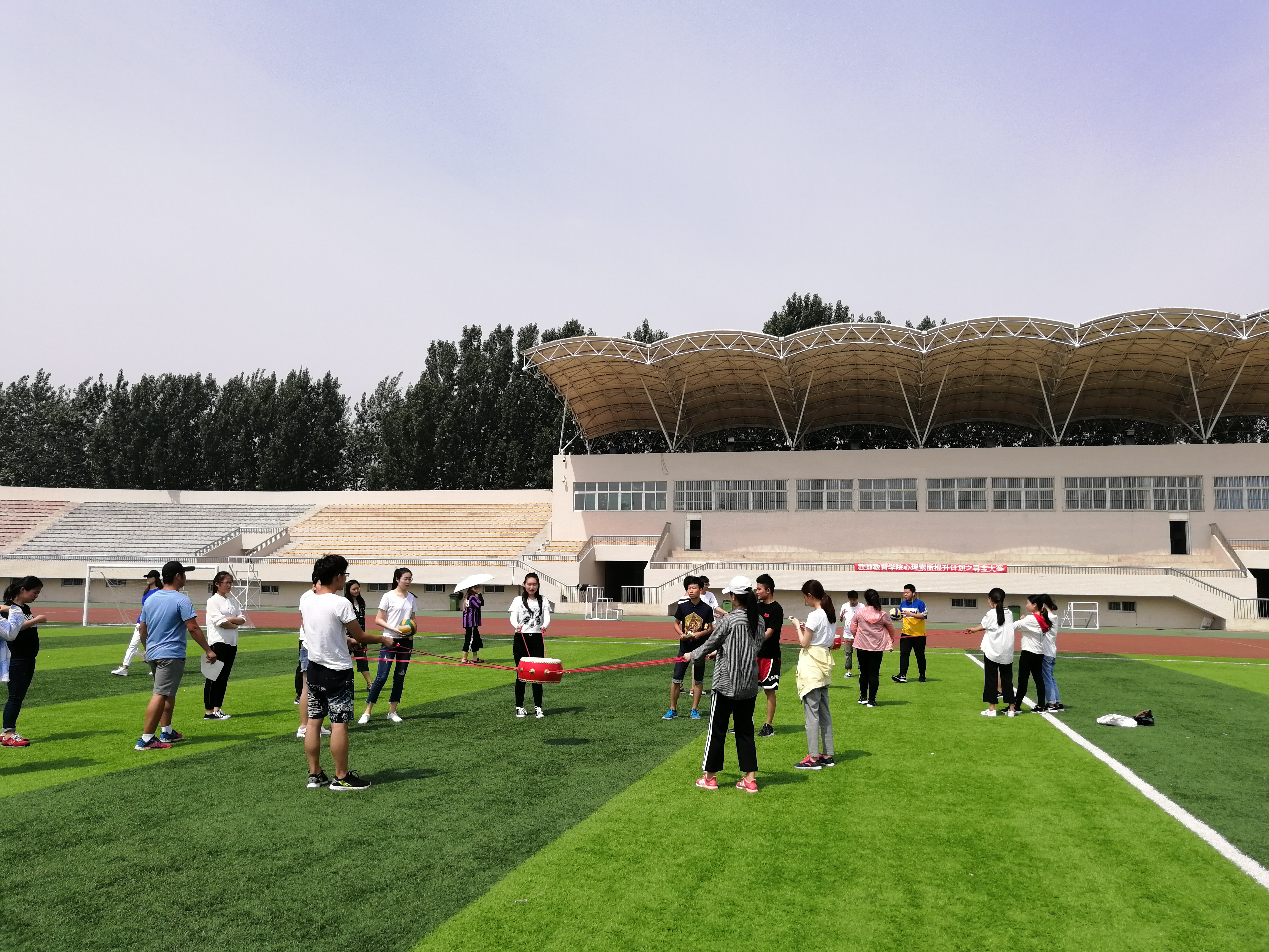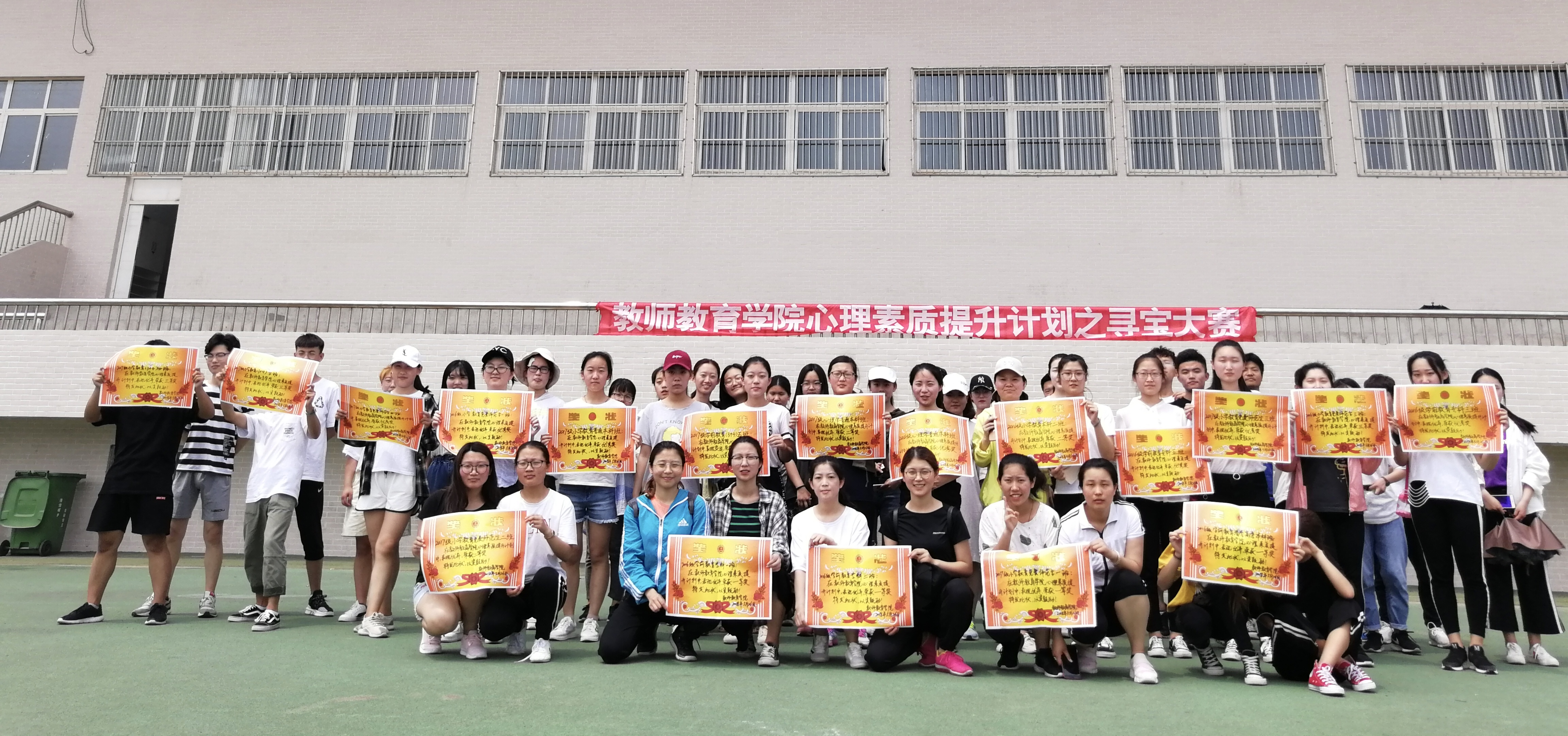 活动分为两个部分的内容,分别是素质拓展和校园寻宝。素质拓展包括鼓动人生、衔杯传水、指压板跳绳、心心相印(背夹球)和十人十一足五个项目,旨在考察同学们的创新力和团结力。参加对象以班级为单位,共有来自学院16、17级小教、学前、心理学专业的20个班级参加。活动过程中大家团结协作,互相配合,积极参与活动讨论,彼此你追我赶,丝毫不甘落后于对方。素质拓展进行到中午11点半结束,随后各班代表通过素质拓展训练的成绩依次按最终排名由高到低顺序抽取校园寻宝所需的纸条线索,并将所得寻宝线索分享给班级,鼓励全员积极参与。