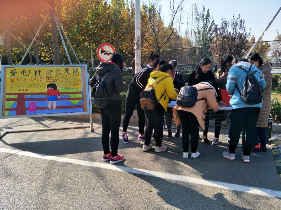 2017年11月15日,由我校爱心社组织举办的时光漫谈活动在学校一食堂三岔路口如期开展,该活动采取让同学们给三年后的自己写一封信的活动形式,让同学们写出自己对未来的憧憬与希冀,明确自己的方向,在三年后收到信时比较自己朝梦想迈近了多少。