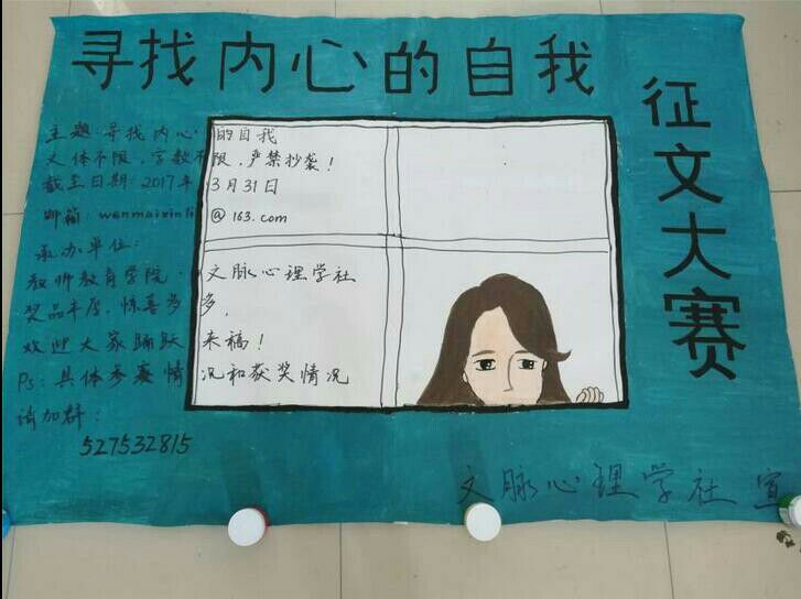 在当今快节奏的生活方式下,为了能让我校大学生在写作的过程中更加深入自己的内心,寻找心灵深处的自己,我院文脉心理学社于2017年3月中旬面向全校学生举办了一场以“寻找内心的自己”为主题的征文比赛活动。
