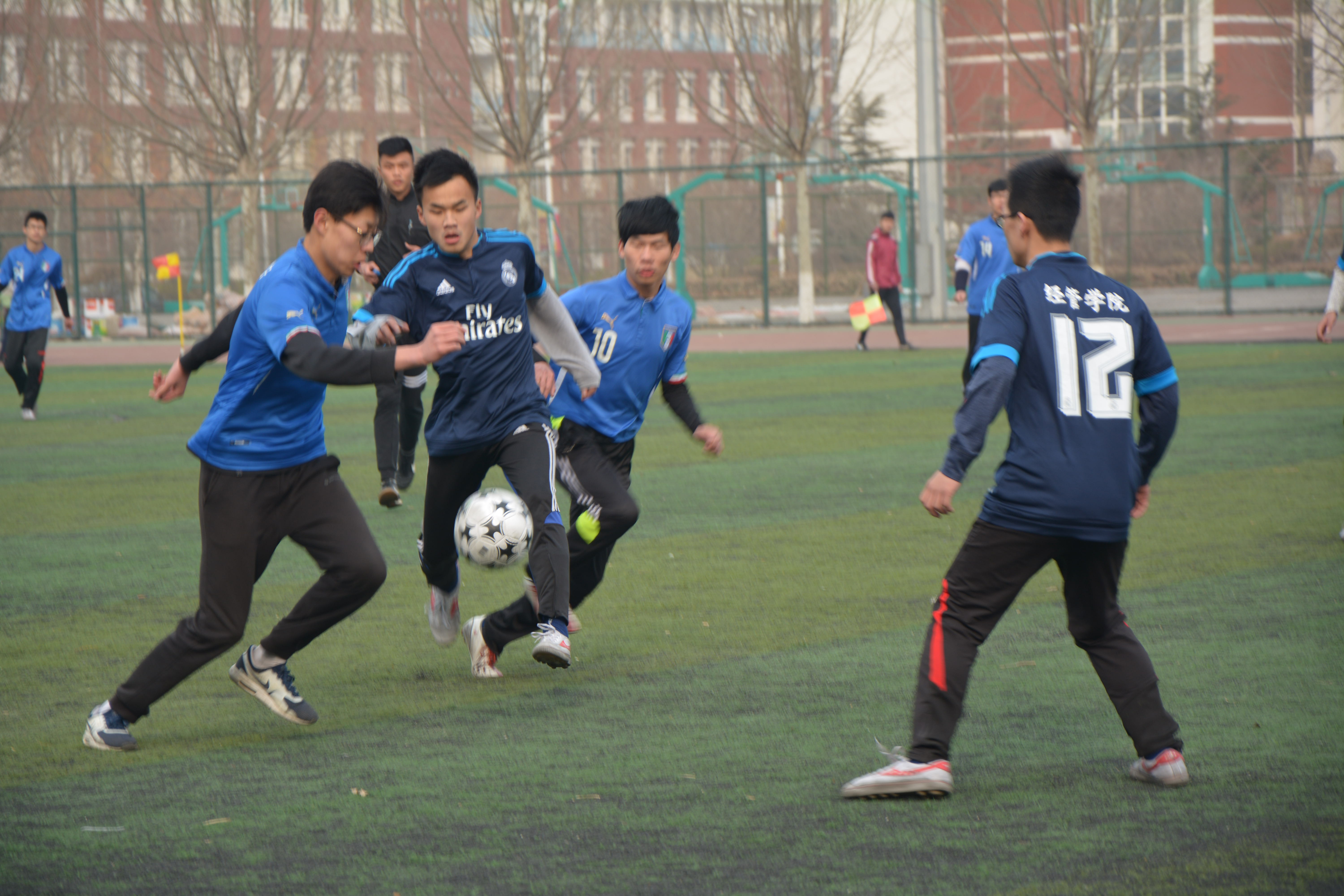 足球队员们早早做好热身运动准备上场,等到裁判一声令下,比赛拉开了帷幕。比赛一开始,双方队员都迅速进入了状态,随着比赛的进行,双方球员踢球状态从保守转为激烈,场外的加油声叫好声不断。比赛进行将近三十分钟,我院球队发起猛烈进攻,通过球员们的默契配合和精彩的球技,我院十分钟连进两球,大家都在激动地为他们喝彩。虽然天气没有转暖,但是在比赛进行中球员们的热情让现场一点点温暖起来,他们的默契和努力感染着现场的每一位观众。