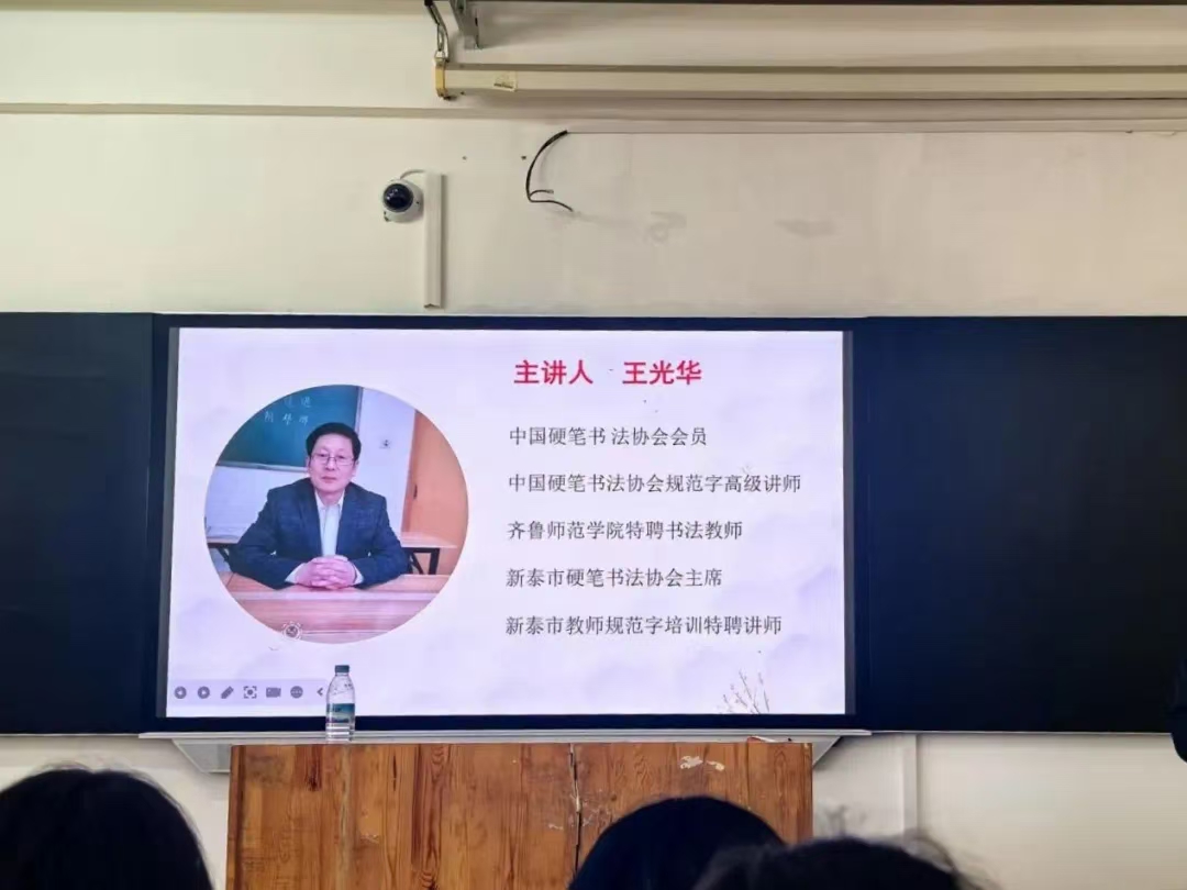 此次活动特别邀请了新泰市硬笔书法协会主席王光华老师作为主讲嘉宾,为同学们讲授钢笔字和粉笔字的书写规范。本次会议由社团社长仇佳惠主持,社团指导教师袭著高参加本次讲座。